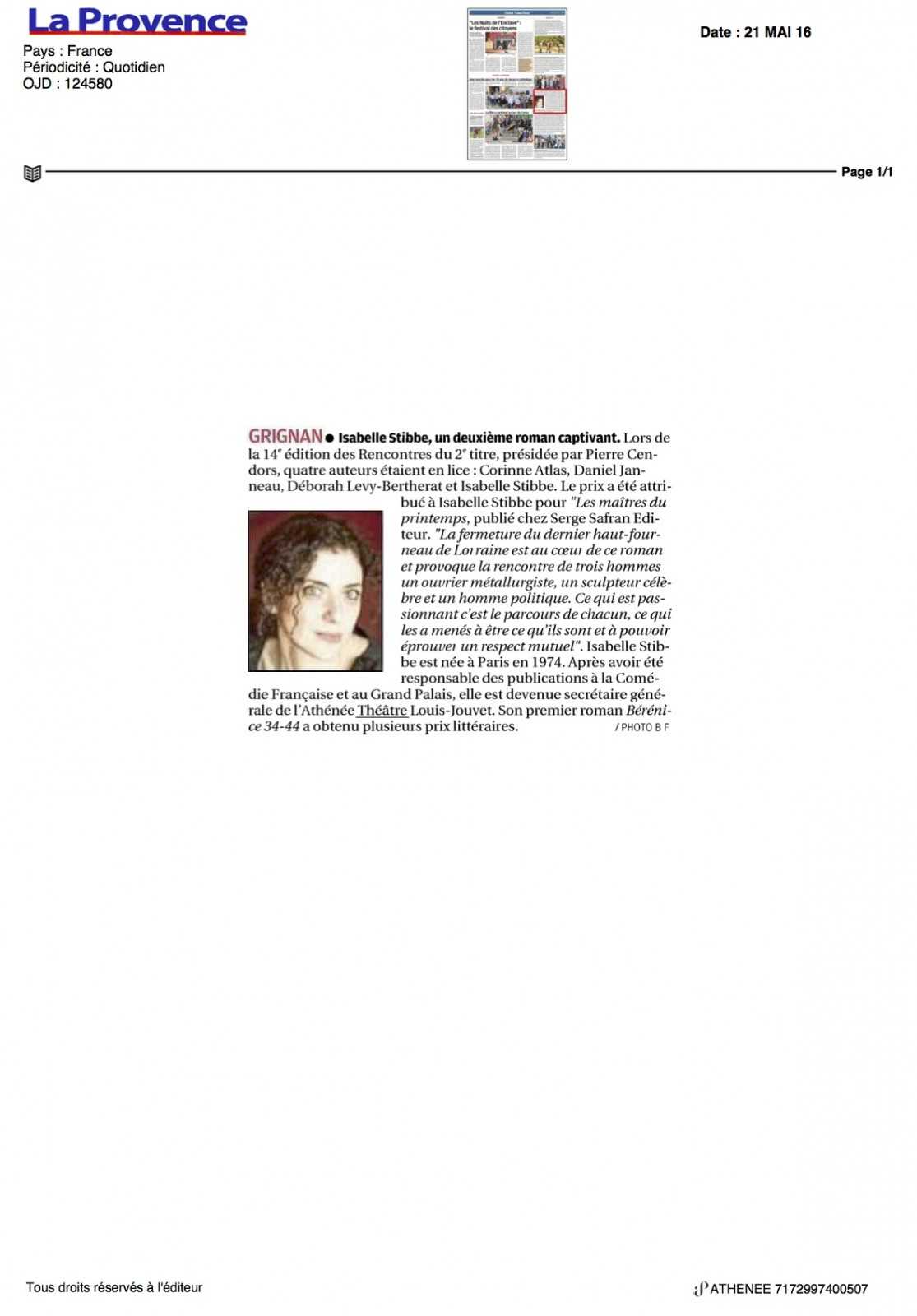 Article dans La Provence sur la remise du Prix « Rencontres du IIe Titre » à Isabelle Stibbe pour son roman Les Maîtres du printemps