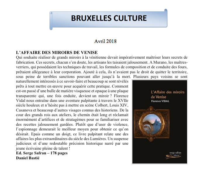 Florence Vidal, diplômée de l’Institut d’Études Politiques de Paris, consultante internationale et historienne. Elle est très attachée à l’histoire de la Vénétie. D’où cet essai historique unique : L’Affaire des miroirs de Venise. Parallèlement paraît chez Pocket Les petites phrases qui ont changé l’Histoire.